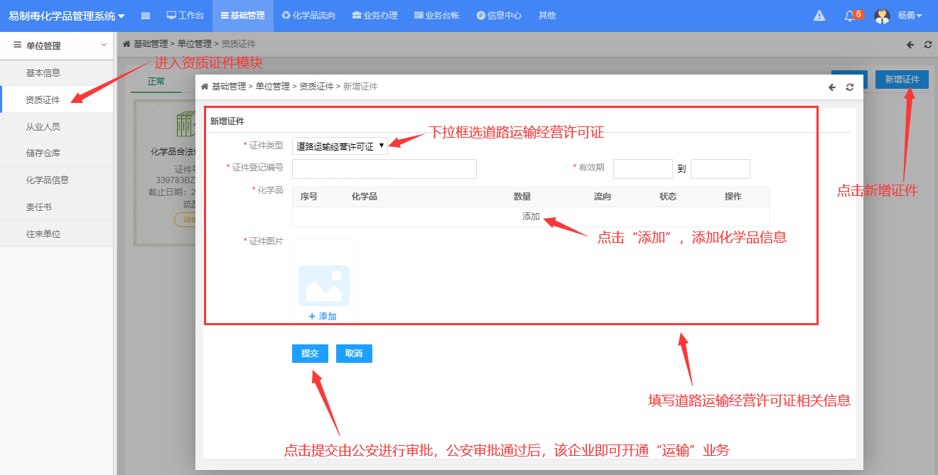 需要开通新业务,按照上图提示上传相应的资质证件即可开通业务,例:需要开通运输业务